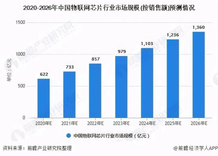 隨著傳統行業自動化升級,物聯網在垂直領域終端用戶的滲透率提升,物聯網芯片市場快速增長,前瞻產業研究院分析預計,2022年我國物聯網芯片市場規模可達857億元人民幣,有望在2024年達到千億規模,來自Counterpoint的數據顯示,中國消耗了全球近60%的蜂窩物聯網芯片。